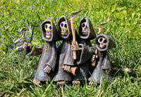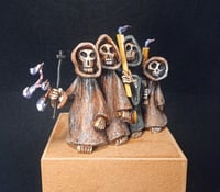 The ”Hueste de Ánimas” (Host of Souls) is a collaboration between the illustrator Tomás Hijo, the researcher Jesús Callejo and the sculptor Miguel Elisardo Bueno, based on the book “El mundo encantado de Castilla y León” edited by the Ethnographic Museum (Zamora). It is a procession of doomed souls that travel at night along the lonely roads of León (Spain). If you find it and you’re not careful, they’ll take you with them. Other names and manifestations are the Holy Company from Galicia, Güestia from Asturias and Huestantigua from Castilla. They are also related to the Sluagh na marbh (Host of the Dead) from Ireland and Scotland and the Wild Hunt from Northern Europe.