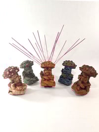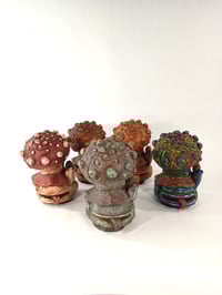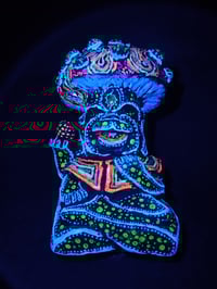 His calm face reminds us of the lion-man of Ulm and his line of shapeshifters and lycanthropes. It has the four arms of Soma and the style of the mushroom stones. One ear is of Buddha and the other of the sprites and spirits. They dress the cardinal's mozzetta and in their hat the spiral pattern of the amanita is furrowed by an undulating labyrinth that leads us among pareidolias to a runic secret. With his eyes closed and open at the same time, he whispers the secrets that perceives with his esoteric third eye. Levitating in a meditative and relaxed pose, he holds the pineapple of sacred geometry while his hidden arm breaks its integrity as a nod to the recreational use. On the back we can see the imperfection of the pineapple and the hidden face of our beloved Musho. Inside itself they will hide the secret that you want to tell it.