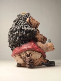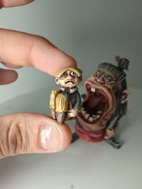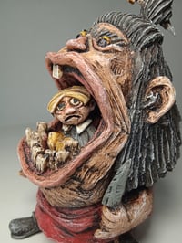 La Zarrampla is a child eater ogre and the second collaboration between the illustrator Tomás Hijo, the researcher Jesús Callejo and the sculptor Miguel Elisardo Bueno, based on the book "The Enchanted World of Castilla y León" edited by the Ethnographic Museum (Zamora). In their book they define her as "another of those indefinitely creature that scares children, with bad tempers and feminine appearance. A true Castilian ogress characterized by being large, chubby, somewhat deformed in appearance, having a gigantic mouth and a large crop or belly with an insatiable voracity. Prey to gluttony, it incites her to devour absolutely everything, whatever happens." It is also known by the following names: Zamparrón, Tragaldabas, Tía Melitona... Our work represents three key characters of the legend as it is collected in their book: La Zarrampla, the child who is a separate figure and can be extracted and inserted into the mouth and the little ant that itches the Zarrampla's ass and makes her dance, which causes the child to come out unharmed. Seen from the front the ogre appears to be dancing.
